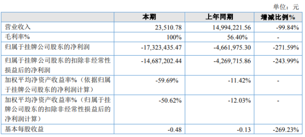 据了解,报告期内,公司实现营业收入23,510.78元,比上年度下降99.84%,营业利润-2,023.02万元,较上年度下降265.91%;净利润-1,732.34万元,较上年度下降271.59%;截止2019年12月31日,公司总资产5,279.61万元,较期初下降17.19%;净资产2,060.76万元,较期初下降47.69%;经营活动产生的现金流量净额为-679.31万元。
