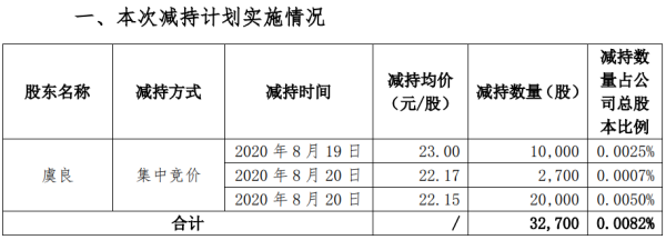 截至本公告日,股东虞良在深圳证券交易所通过竞价交易方式完成3.27万股的减持,权益变动前虞良持股0.06%,权益变动后持股比例为0.05%。